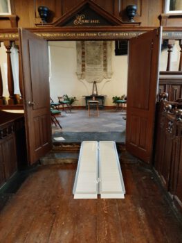 Een nieuwe aanschaf: een oprijplaat, voor de toegankelijkheid van het koor. Er komt tegenwoordig een klein projectkoor oefenen, waarvan een van de leden in een rolstoel zit. In overleg met haar kozen we voor deze opvouwbare dubbele plaat. Licht te hanteren en goed weg te bergen. Vanmiddag de proef op…