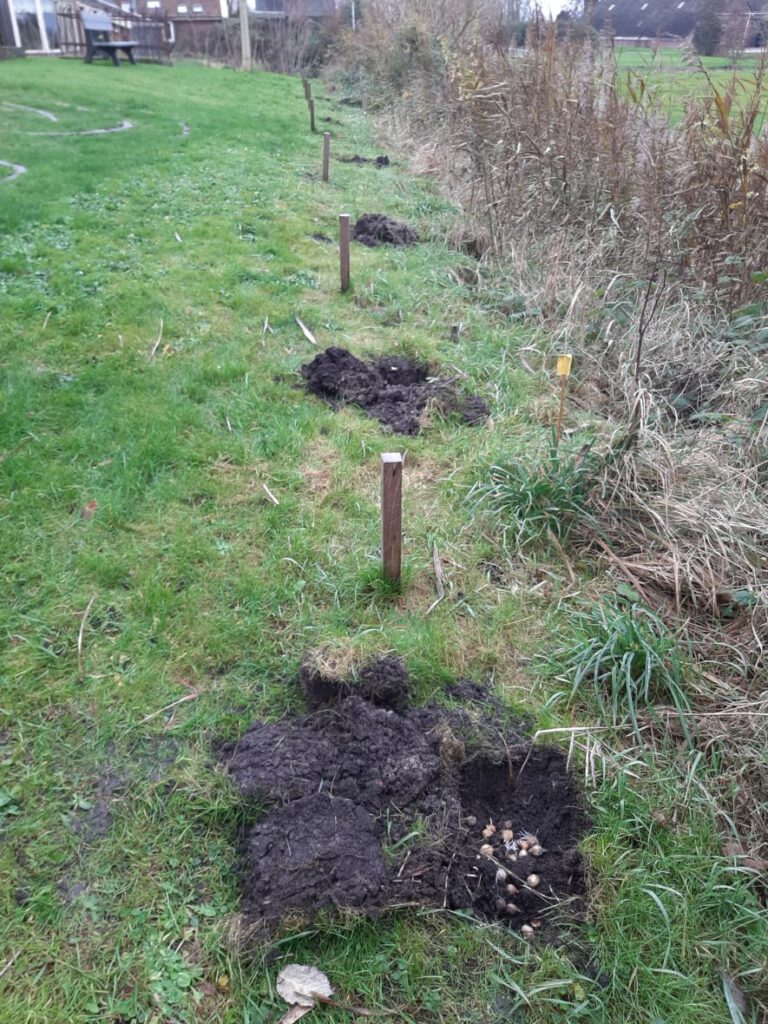 Een beetje aan de late kant, maar we hebben weer bollen gepoot voor ons biodiverse randje. Hopelijk met meer succes dan het vorig jaar.