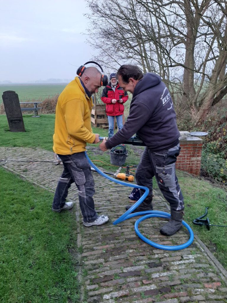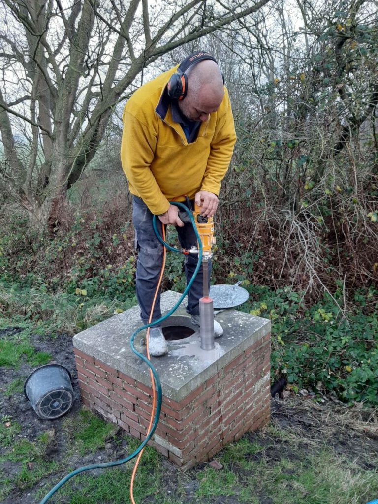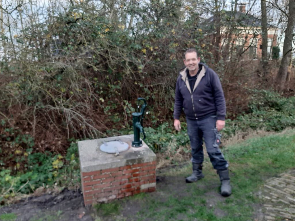 Vandaag werd de put voltooid. Ron Zeeman (Schoonmaakbedrijf en meer) en Jan Lindeman (Betonboor- en zaagbedrijf) zorgden voor de installatie van de handzwengelpomp.