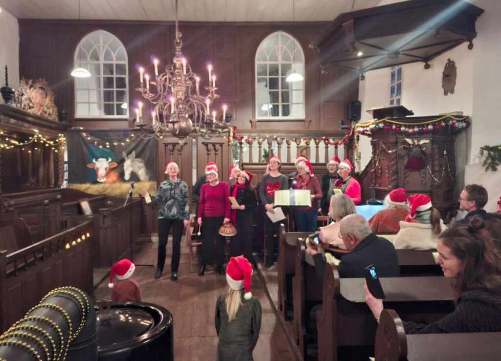 Er waren ons kerstmutsen geschonken door een gever die liever anoniem bleef. Bij het laatste lied ‘Merry Christmas’ gingen ze op. Vooral de flikkerlichtjes waren sfeerverhogend… Dank aan de gulle gever. De avond besloot met een genoeglijke ‘nazit’ in het koor, met Glühwein, chocolademelk en kerstkransjes.