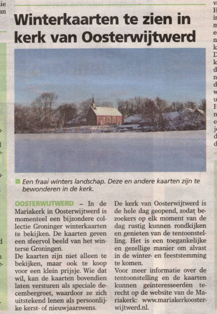 Het was even schrikken, toen ik de Ommelander Courant vanmorgen uit de bus viste en daar deze wervende aankondiging in las. Geweldig leuk natuurlijk, alleen… “een tentoonstelling” hadden we niet beloofd, alleen gezegd dat er winterkaarten te koop waren. Eerlijk gezegd stonden ze in een grote doos, waarin ieder naar believen kon snuffelen. Maar met deze eervolle vermelding in de krant kon dat natuurlijk niet zo blijven. Nu liggen op twee schragentafels onze winterkaarten uitgestald. En we plakken vandaag de mooiste nog bij. De sneeuwkaarten (dubbele blanco kaart plus envelop) kosten € 0,50, de kerstgroep (grote blanco kaart met envelop) € 1,-. Welkom!